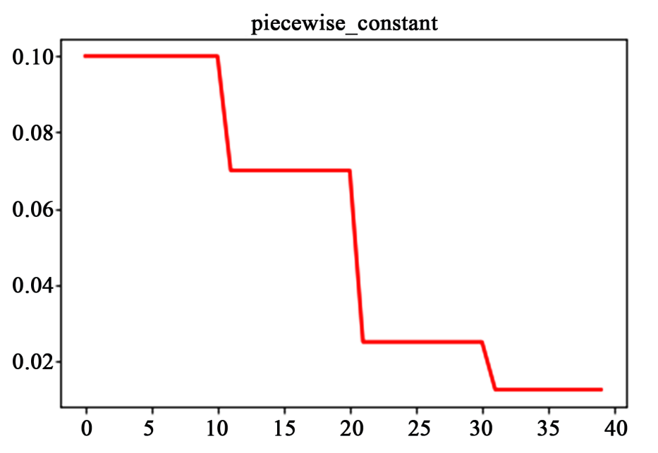 分段常数衰减需要事先定义好的训练次数区间,在对应区间置不同的学习率的常数值,一般情况刚开始的学习率要大一些,之后要越来越小,要根据样本量的大小设置区间的间隔大小,样本量越大,区间间隔要小一点。下图即为分段常数衰减的学习率变化图,横坐标代表训练次数,纵坐标代表学习率。