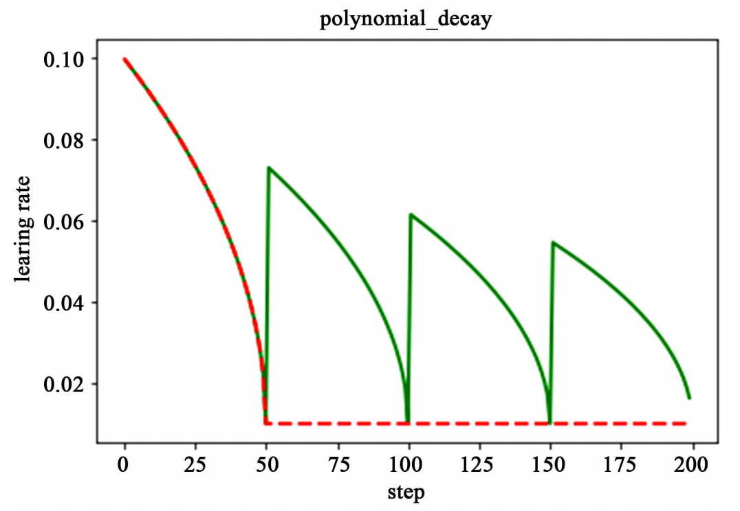 如下图所示,红色线代表学习率降低至最低后,一直保持学习率不变进行更新,绿色线代表学习率衰减到最低后,又会再次循环往复的升高降低。